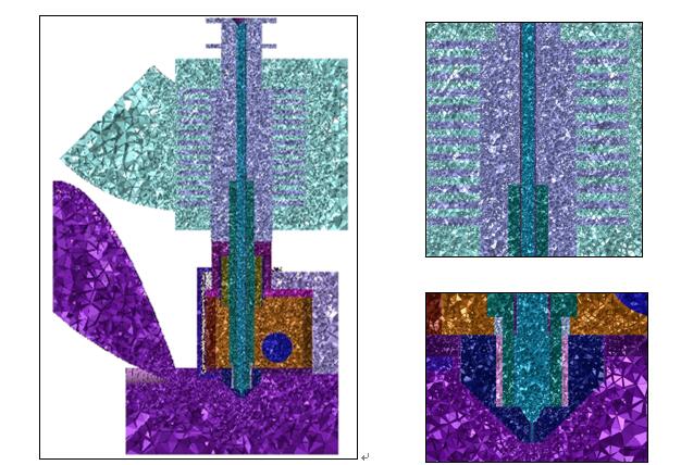 -上部散熱結(jié)構(gòu)及風(fēng)扇附近的強制對流(例如圖2中青色與紫色網(wǎng)格區(qū)域)。考慮到計算成本和結(jié)果精確度,此次仿真重點考慮這兩處流體區(qū)域?qū)囟确植嫉挠绊憽?/p>